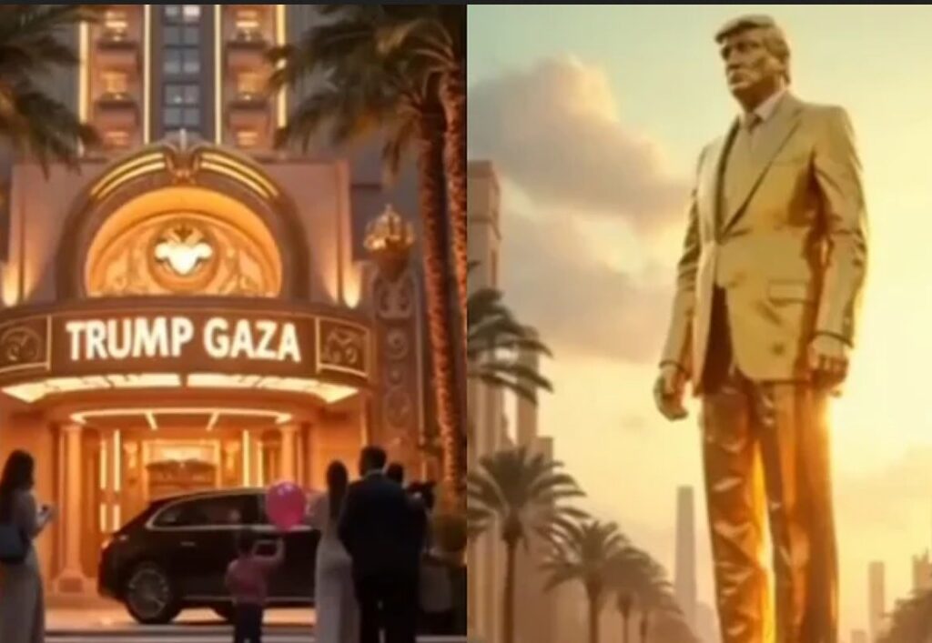 The video posted on the president’s various social channels included towering golden statue of Trump overlooking the resort, with miniature “Trump Gaza” golden souvenirs lining the AI-generated gift shop shelves. #TrumpGaza #Israel #AI